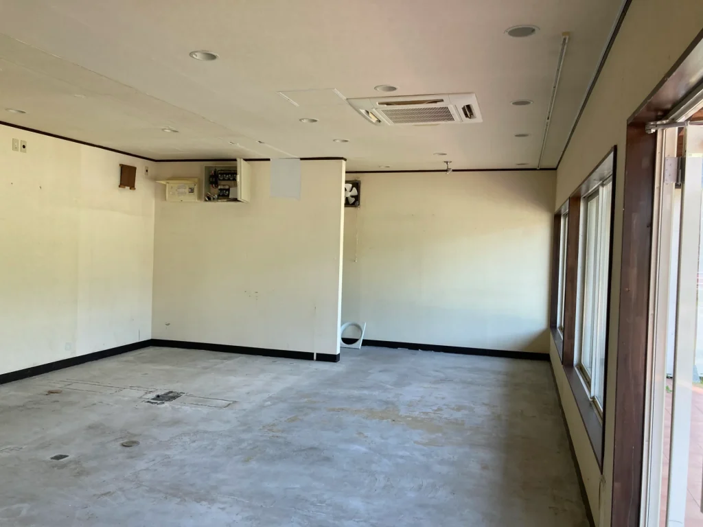 見つけた物件は木造2階建てで、1階が店舗、2階が住居という構成でした。お店の前には砂利の駐車場があり、通り沿いには緑が生い茂り、道路わきには背の高い看板が設置されています。長い間空きテナントだったこともあり、壁の傷みやたくさんの穴、老朽化した設備など、課題が目立つ物件でした。