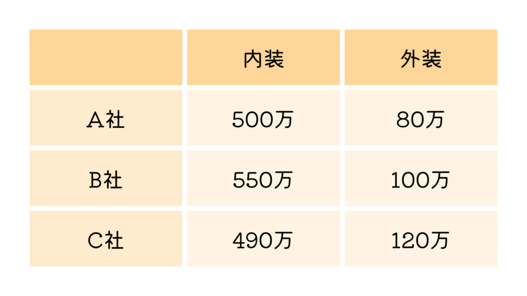 外装と内装に分けて工事金額を比較します。しかし、より細かく比較できる工事項目ごとの比較をお勧めします。工事コスト比較表を使えば項目ごとに費用の割合を見比べることができます。