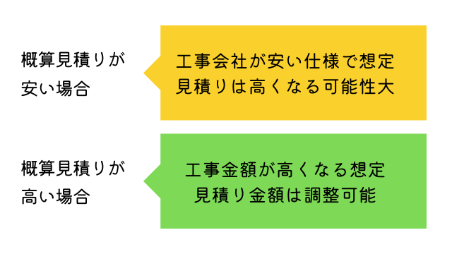 概算見積りをもらった内容が安かった場合は、工事会社が安い仕様で想定していますので、実際の工事見積りは高くなる可能性大です。