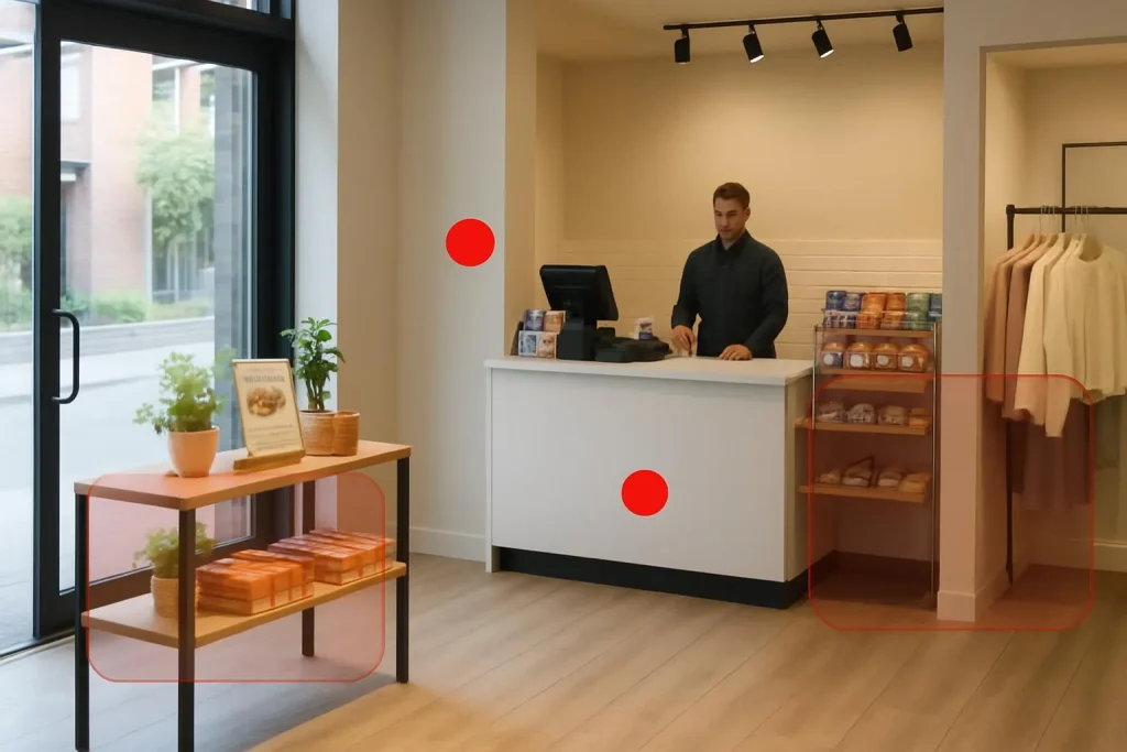 | 入口近く | 入退店管理がしやすい、少人数運営向き、防犯面で有利 | コンビニ、小規模店、カフェ |